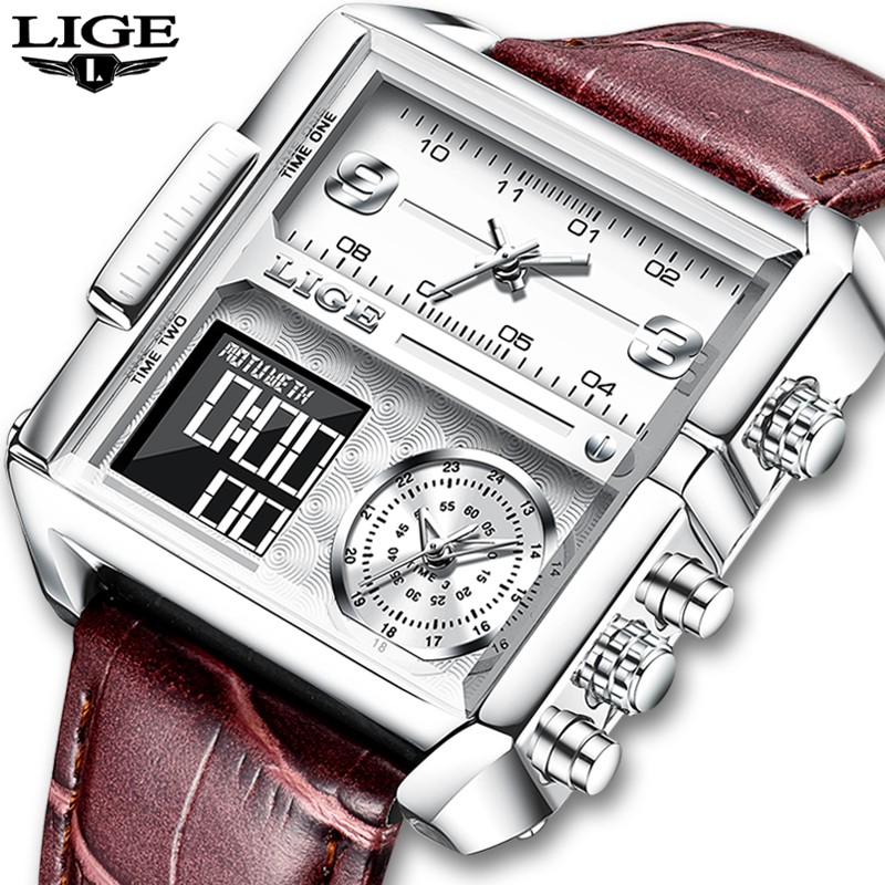 LIGE 8925 Top Brand Luxury Mens Watches Square Digital Sports Quartz Wrist Watch for Men Waterproof Stopwatch Relogio Masculino